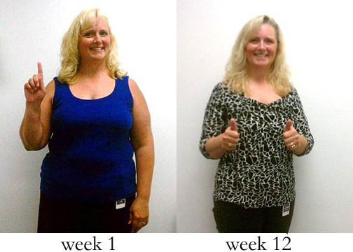 “In the first month the most noticeable thing so far has been the way I feel physically. I no longer feel constantly bloated and my clothes fit me MUCH better. I have lost about 8 pounds in 4 weeks… In appearance, I’ve noticed less flab in the mid-section, I’m starting to see my waist again! My arms and legs also have less flab on them and are slimming down… My strength and endurance has also improved. I can now do almost 10 modified push ups, compared to the 2 I did at the initial testing! My cardio exercises have gotten easier, my breath is not so labored and I enjoy the workouts a lot more now.”